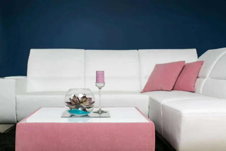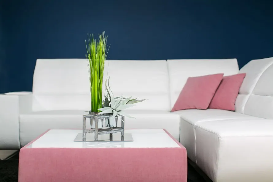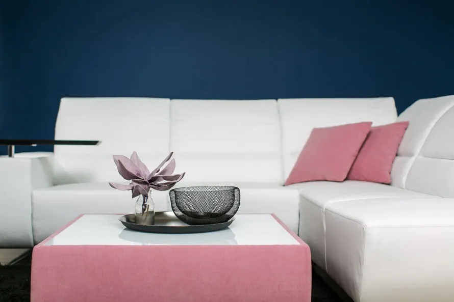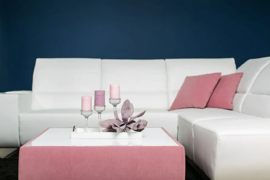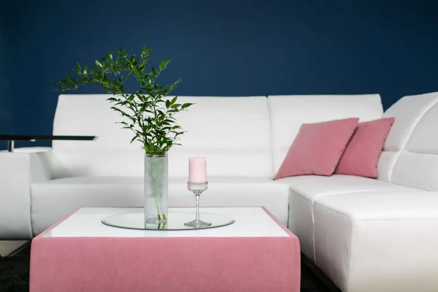 Na obrázku vidíte realizaci dekorování, které se pro nás stalo nejkrásnější a nejvhodnější pro sedačku v bílé kůži jemné spolu s růžovým stolkem a tmavou stěnou v královské modré barvě.