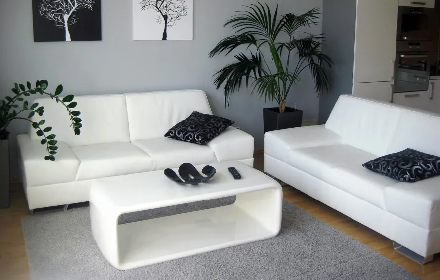 Ne každý se spokojí s něžným světlým interiérem. Milovníci většího vzrušení mohou jasně vymezit hranice bílé barvy tmavými liniemi. Skvělým kontrastem k bílé jsou například i kovové prvky. Náš zákazník vymezil prostor bílé sedací soupravy Monaco černými doplňky a kontrastními obrazy na zdi.