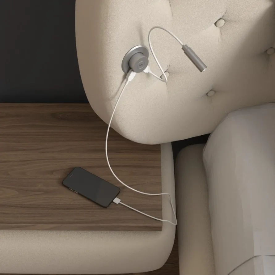 Po těžkém dni se už před spánkem nemusíte ohýbat a hledat zásuvku u postele. Lehnete si a po jemném zatlačení se vysune kovová část nabíječky, do které můžete pohodlně připojit dvě USB koncovky. Například šňůru na nabíjení mobilu nebo tabletu, abyste jej mohli používat v komfortní poloze. Můžete ji využít i jako port pro USB lampičku, která vám diskrétně posvítí, pokud máte chuť přečíst si dobrou knihu a nerušit přitom partnera, spícího vedle.
