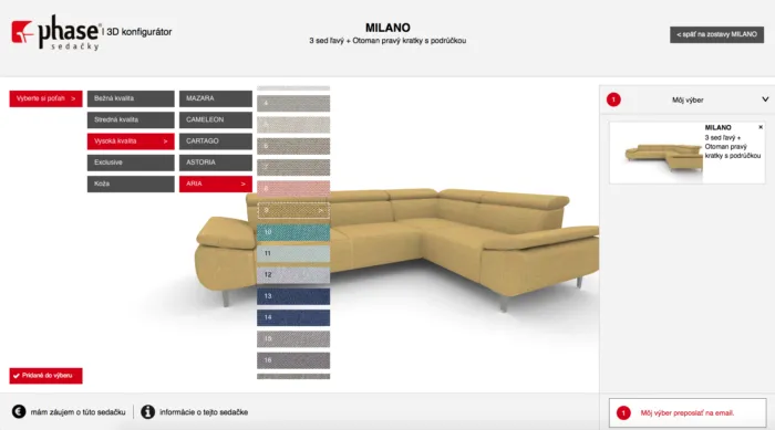 Abychom Vám ulehčili výběr a celou představivost sedačky připravili jsme pro Vás 3D konfigurátor, pomocí kterého si velmi jednoduše můžete na dizajnovat svoji sedačku až do posledních detailů. Svoji vybranou sestavu máte možnost poslat na svůj email. Vámi vybranou nakonfigurovanou sedačku v potahovém materiálu můžete také poslat k nám a my vám vytvoříme cenovou nabídku na míru.