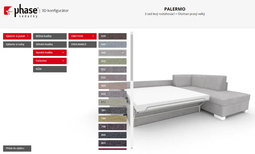Pro ty co si potrpí na kvalitu a luxus měli možnost prohlédnout si nabídku hověziny v různých barvách. Kůže jako potahový materiál je ta nejlepší volba. Je to přírodní materiál, který Vám vydrží roky. V nabídce najdete kolem 50 odstínů barev kůže. Pro ty, co neměli to štěstí vyzkoušet si sedačky Phase a potahové materiály živě, nabídku najdete zde: