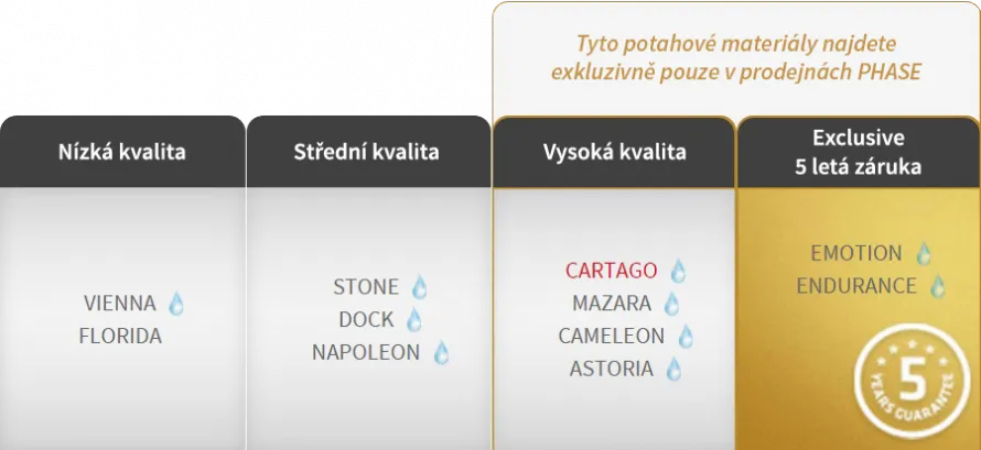 Každý z našich potahů na sedačky Phase, který je označen symbolem kapky, je omyvatelný. Zdroj: sedackyphase.cz